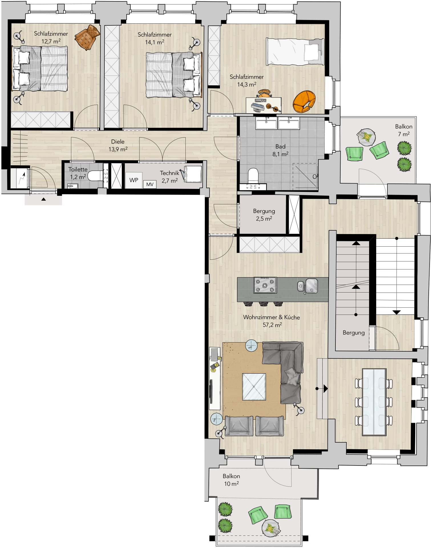 ▶ zwei zusätzliche Abstellräume (ca. 2,5 m²) hinter der Küche